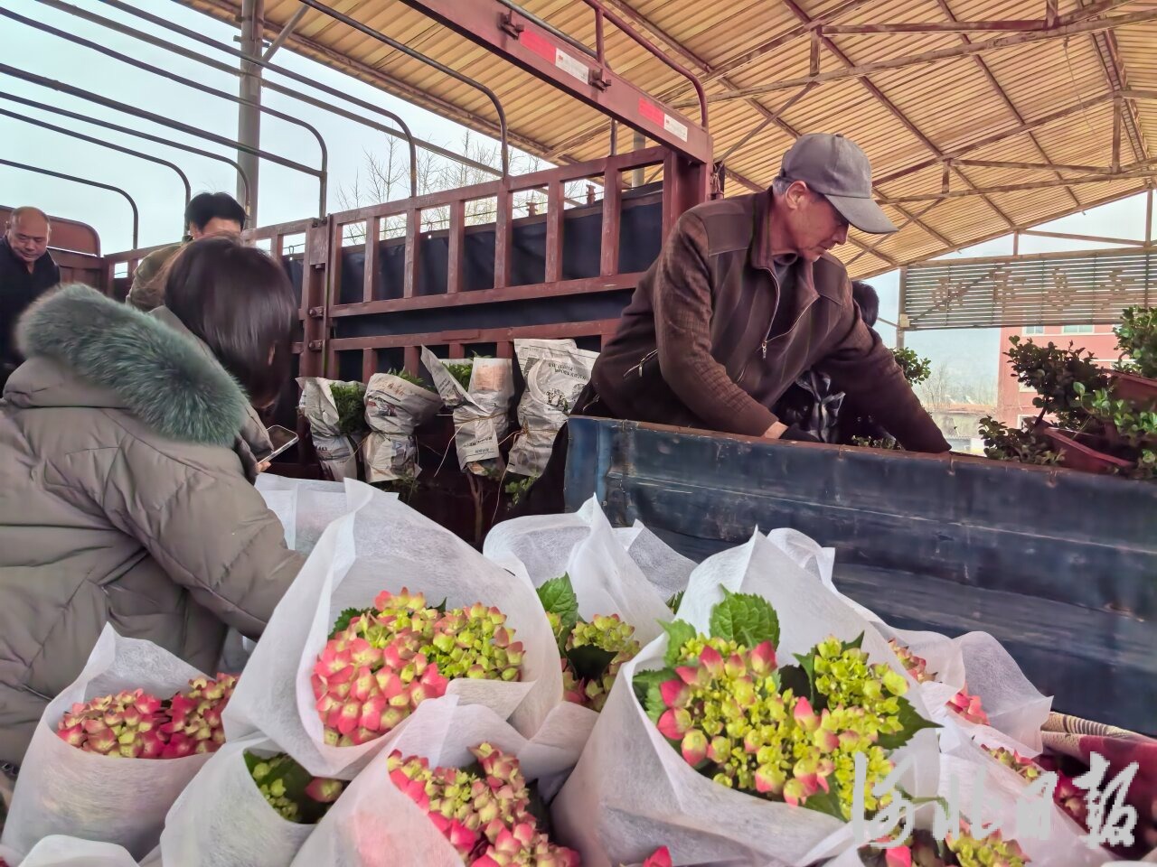 3月26日,杏树园村村民在村内花卉交易市场,将售出的花卉装车发货。河北日报记者 张辉摄