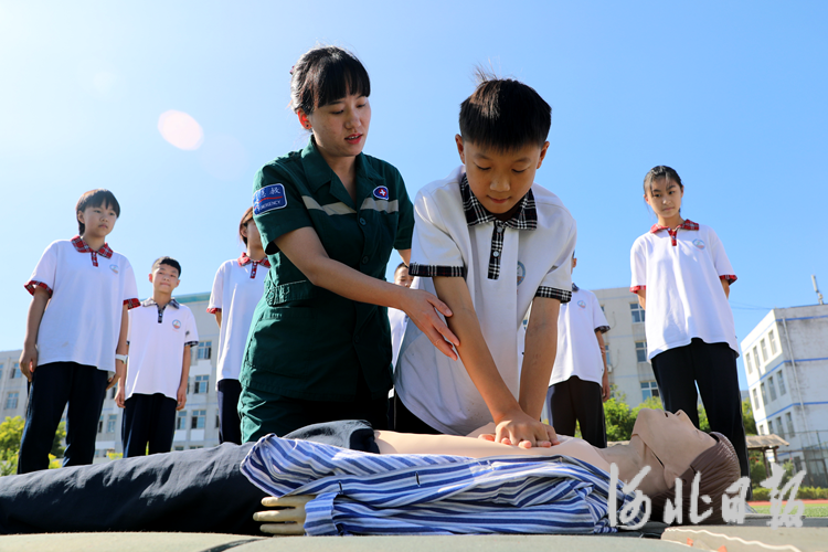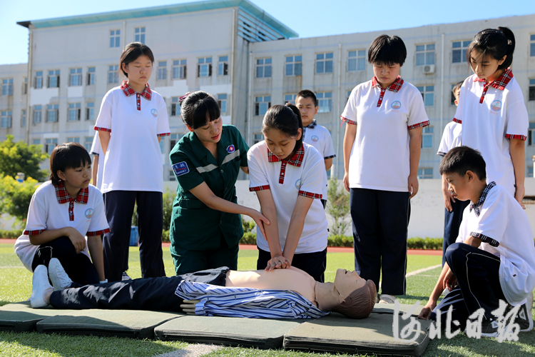 随后,医护人员现场演示了心肺复苏的方法,包括按压频率、按压深度、按压手法、人工呼吸方法等,帮助学生清楚理解和掌握相关知识与技能。在医护人员的指导下,学生们踊跃尝试,亲自操作和演练所学知识,认真练习动作要领。