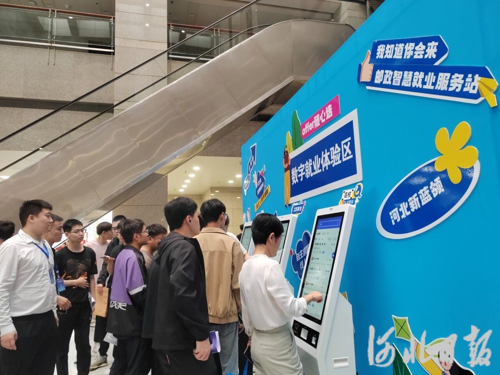 5月20日,河北省高职院校2024应届毕业生和企业就业洽谈会在石家庄人民会堂举行。图为同学们正在数字就业体验区了解情况。河北日报记者方素菊摄