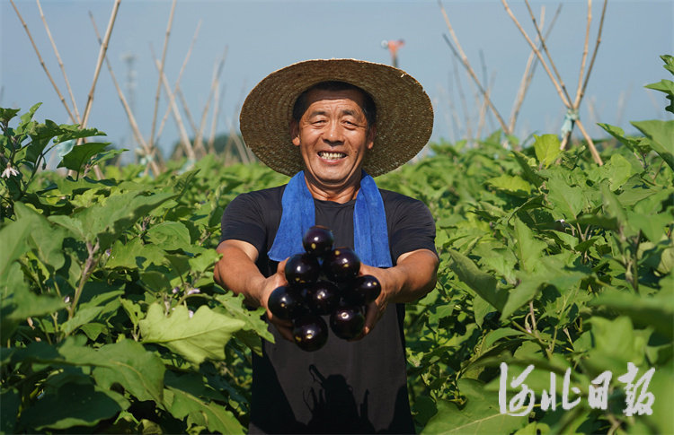 8月1日,在固安县宫村镇东米各庄村田间,农户展示刚刚采收的茄子。通讯员门丛硕摄