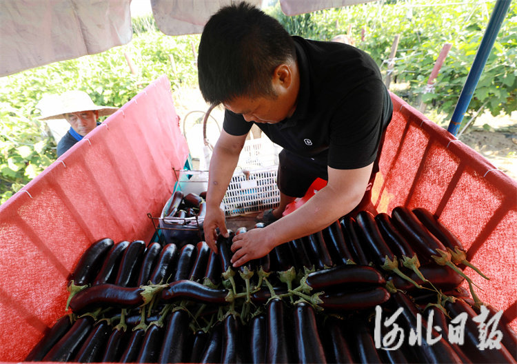 8月1日,在固安县宫村镇东米各庄村田间,农户将采收的茄子装车。通讯员门丛硕摄