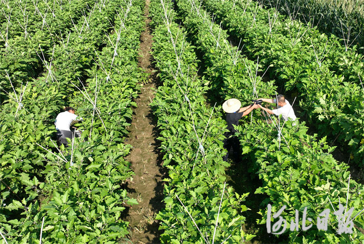 8月1日,在固安县宫村镇东米各庄村田间,农户正采收茄子(无人机拍摄)。通讯员门丛硕摄