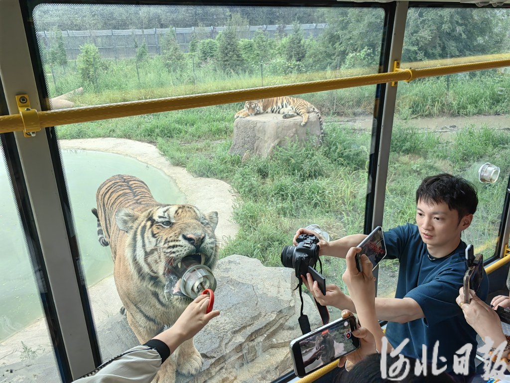 8月12日拍摄的黑龙江东北虎林园网红虎“二埋汰”与游客互动。河北日报记者马朝丽摄