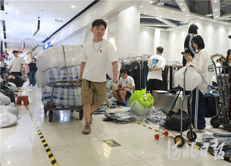 河北日报客户端讯(通讯员陈放)8月12日,在固安县京津冀(固安)国际商贸城内,琳琅满目的秋装已经摆满各家商铺的货架,来自京津冀及其他地区的消费者、进货商穿梭其间,一派火爆的“拿货”景象。