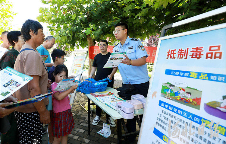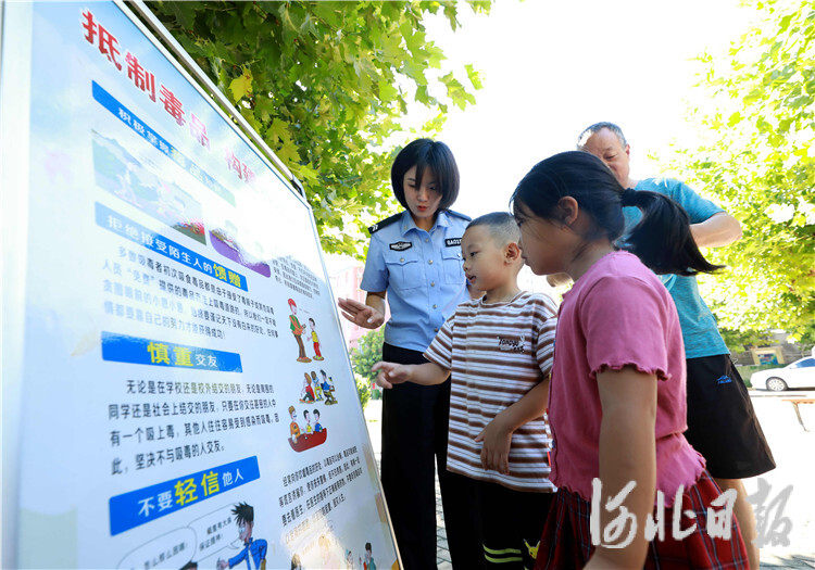 图为8月27日,在固安县学府芳园小区,民辅警正在为青少年儿童讲解禁毒知识。通讯员张思琪摄