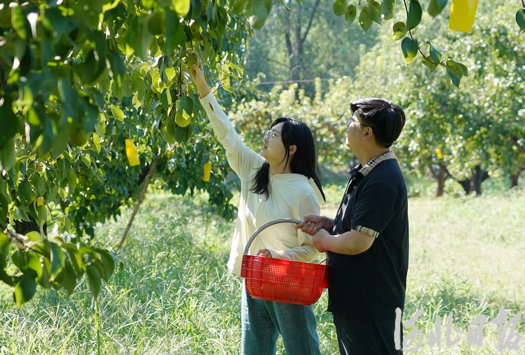9月12日,在固安县东湾镇东大营村梨园内,游客正在采摘鲜梨。通讯员吴迪摄