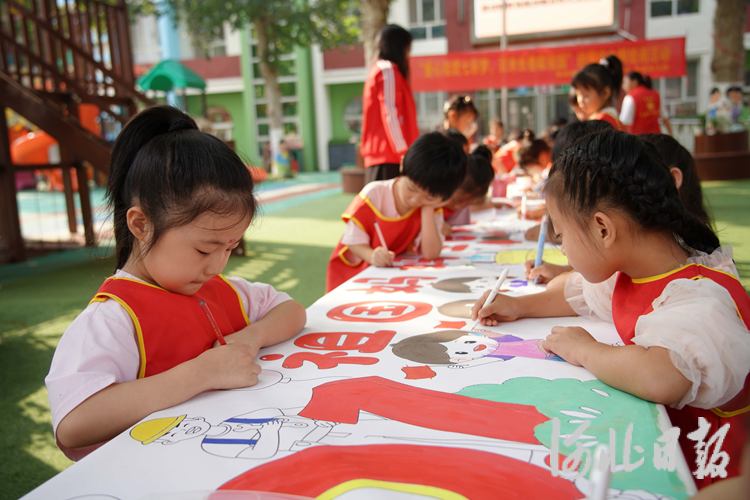 图为幼儿们在长卷上认真作画。