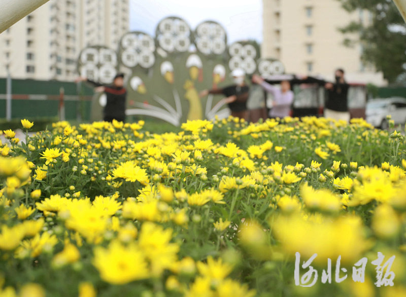 10月1日,市民在固安县的一处花坛前跳广场舞。肖靖凯摄