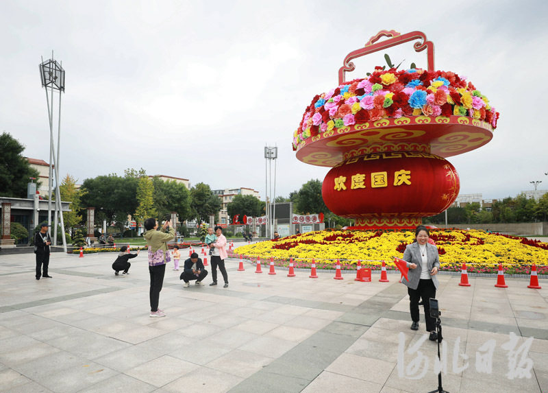 10月1日,在固安县人民广场,市民与巨型花篮合影留念。肖靖凯摄