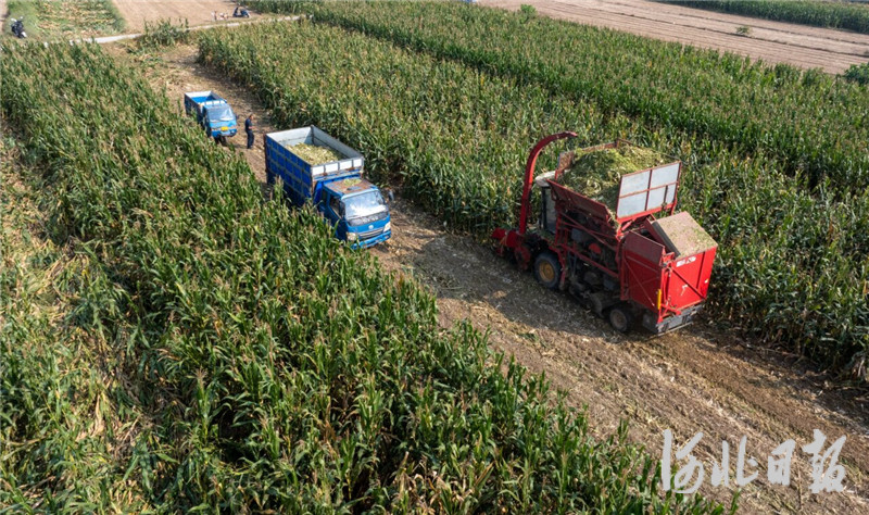 9月25日,在定兴县内章镇的玉米地里,玉米收获机正在进行收割作业。张曾良摄