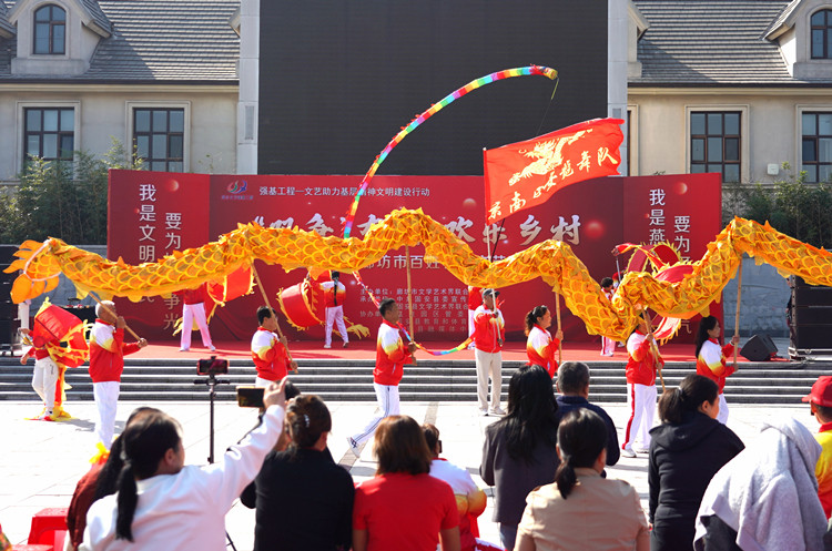 10月11日,在百姓村晚文艺展演活动现场,演员们在表演舞龙。吴迪 摄
