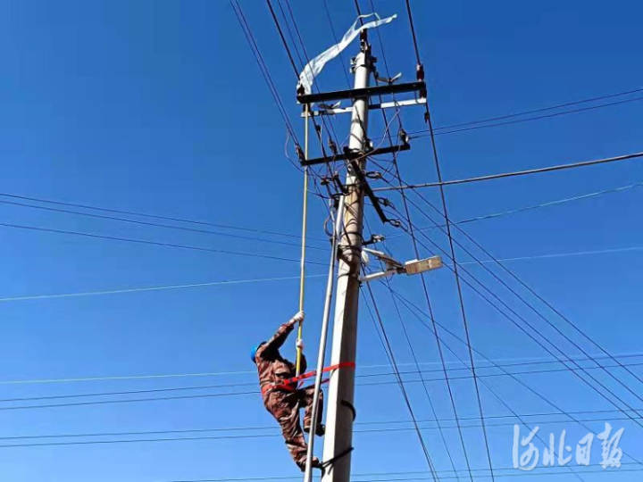 图为国网冀北电力有限公司香河县供电分公司工作人员清除悬挂垃圾。