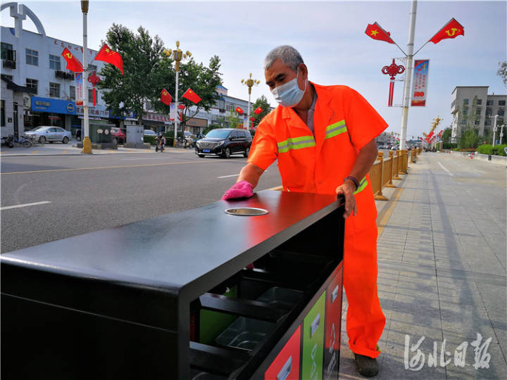 图为香河环卫工人在擦拭垃圾桶。