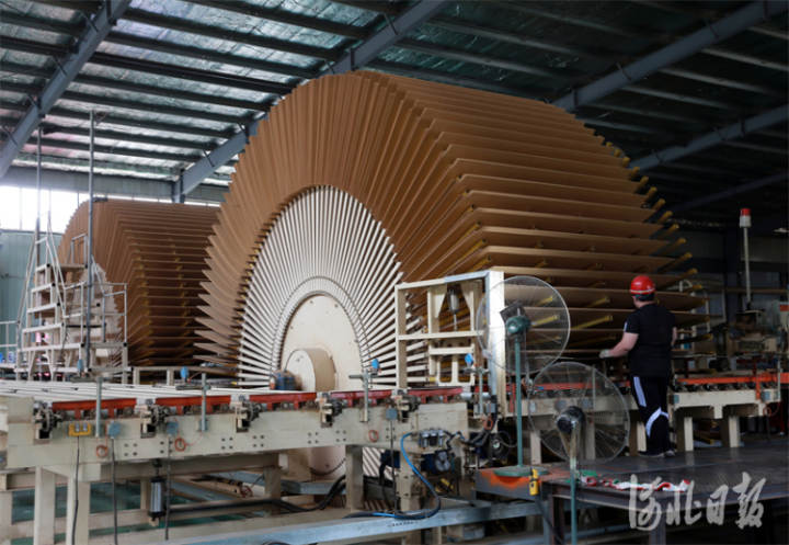 优势传统产业向“绿”而行,图为河北金秋木业有限公司现代化人造板生产线。
