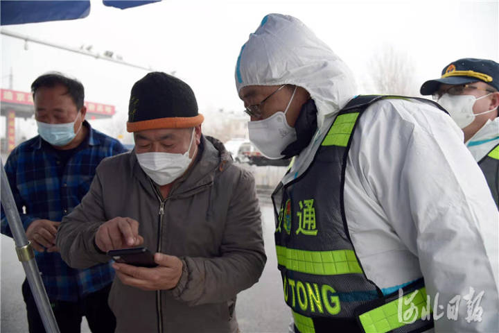 3月18日,在河北省文安县廊沧高速文安出口防疫卡点,交通局值守人员正在查看往来司机健康码、行程卡。高丹钰摄