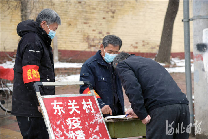 河北日报客户端讯 (通讯员张炎、高丹钰)3月18日下午,一场大雪不期而遇,在漫天飞雪中,河北省廊坊市文安县各地各部门浴“雪”战“疫”,连续奋战在一线的“文安人”依旧坚守在疫情防控的前沿阵地。