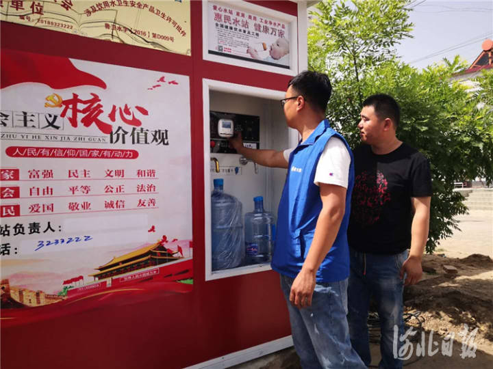 6月3日,文安县大留镇镇黄李村健康惠民水站完成安装调试,正式投入使用。图为廊坊艾渡商贸有限公司工作人员帮助文安县大留镇镇黄李村村民打水。