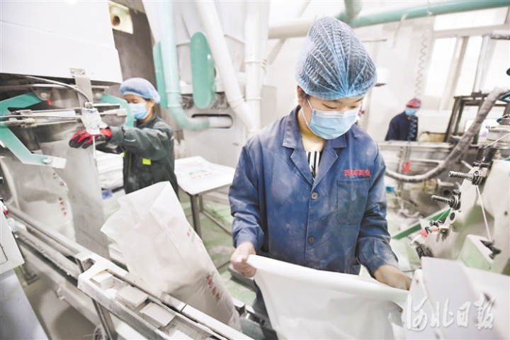 近年来,河北省廊坊市文安县坚持把产业扶贫作为群众脱贫的根本途径和长久之策,通过土地流转、资金入股、种植技术培训等方式,构建精准防返贫长效机制,使困难群众在家门口实现稳定增收。这是4月27日,在文安县新镇镇一家扶贫企业内,工人正在灌装面粉。通讯员王晖摄影报道