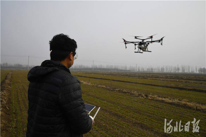 2月21日,在河北省文安县德归镇李黄甫村,农户正在操作无人机为麦田撒药。
