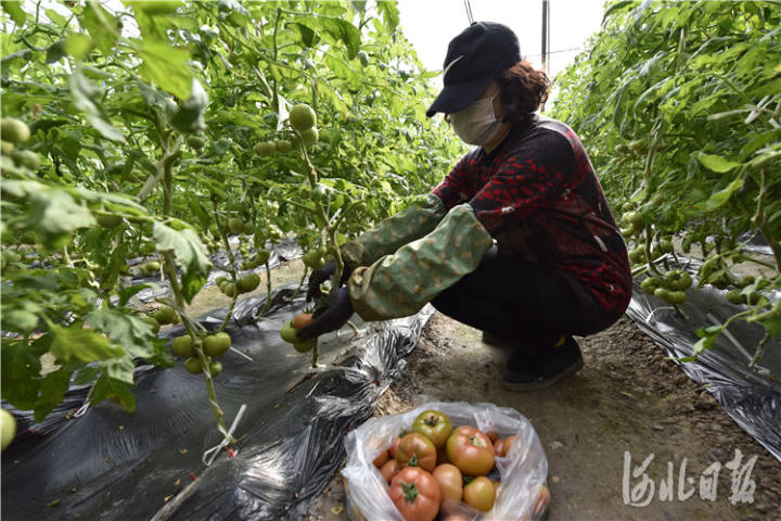 2月21日,在文安县大围河乡贾头村情满四合院种植园,农户正在大棚里采摘西红柿。