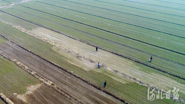 2月21日,在河北省文安县德归镇李黄甫村,几名农民正在为小麦施肥。(无人机拍摄)