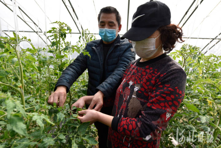 2月21日,在文安县大围河乡春满四合院种植园,当地农业技术人员(左一)正在蔬菜大棚里为农户做技术指导。