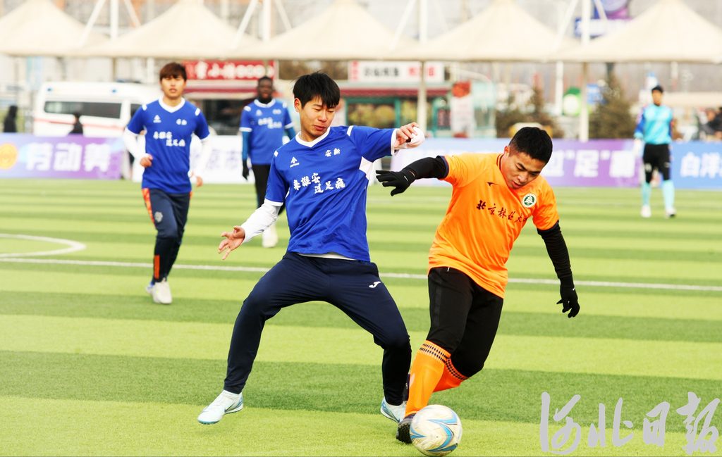 1月1日,“迎新年 来雄安过足瘾”北京林业大学职工足球队与安新县职工足球队友谊赛在雄安大健康体育公园进行,图为比赛现场。河北日报记者 刘光昱 摄