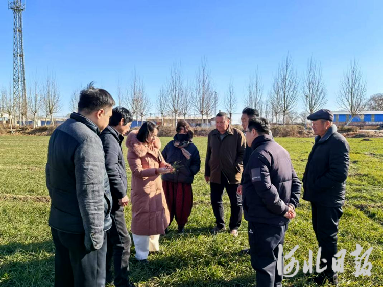 1月10日,在邢台市南和区郝桥镇红庙村的麦田里,农技人员正在指导种粮大户进行小麦越冬管理。