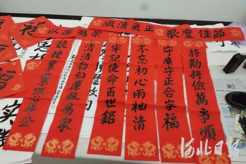 河北日报客户端讯(曹杰)近日,唐山市路北区纪委监委联合文化路街道健康楼社区书法爱好者,开展“写廉洁春联 送新春祝福”主题活动,为社区居民书写富含“廉”文化元素的春联20余副。