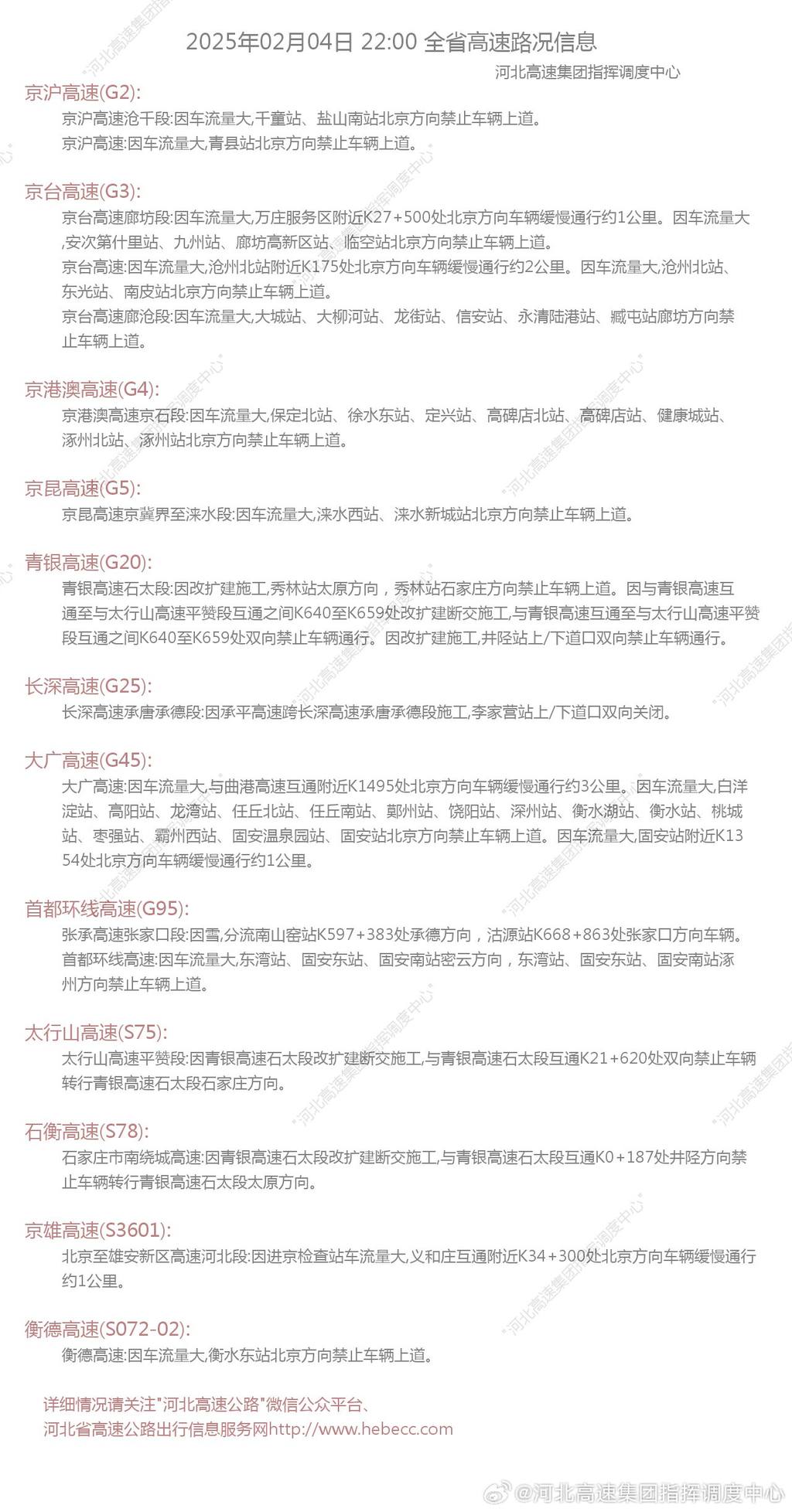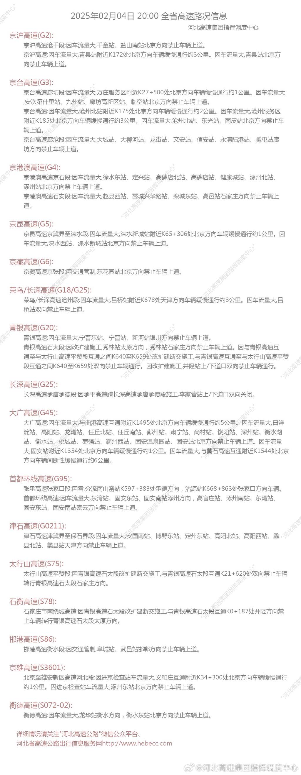 衡水辖区:【大广高速】北京方向1544公里(黄石互通附近)车多缓行,间断放行车辆,沿线北京方向关闭;【衡德高速】衡水方向关闭。