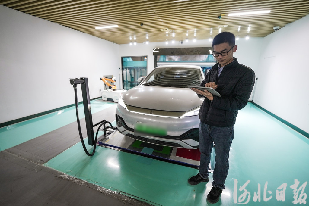2月10日,在雄安新区剧村变电站地下2层的智慧充电区,国网雄安新区供电公司工作人员正在操控机器人为新能源汽车充电。 河北日报记者 李 畅摄
