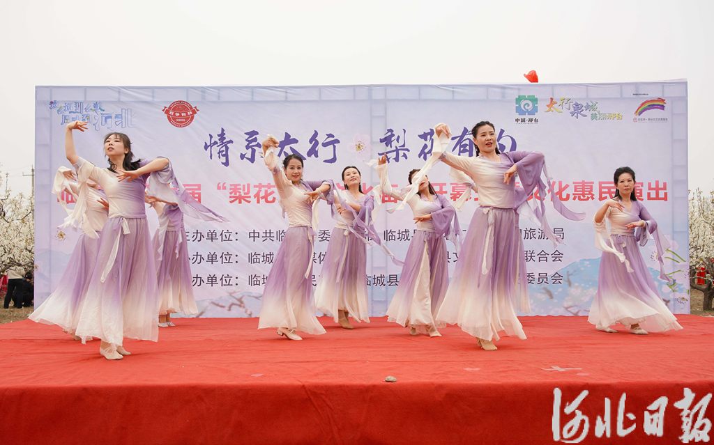 当天,临城县第六届“梨花渡”文化庙会在该梨园开幕,以“情系太行 梨花有约”为主题的文化惠民演出同步启动。开幕式上,开场舞《盛世欢歌》、舞蹈《我像三月梨花开》、歌曲《摘下满天星》、电吹管《梨花颂》、旗袍走秀《红枣树》、歌伴舞《祝福祖国》、扇子舞《中国梦》、舞蹈表演《盛世腰鼓》等节目轮番上演,构成了一幅“进梨园、听春曲”的美丽画卷,为在场观众游客献上一场文化大餐。