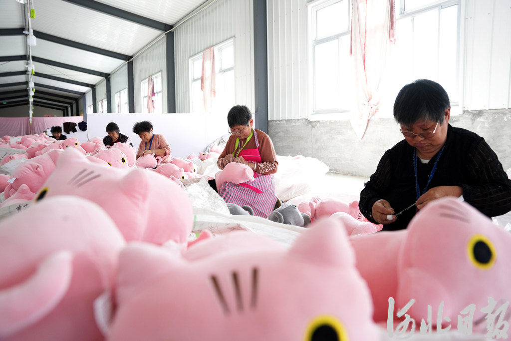 4月21日,在隆尧福顶工艺礼品有限公司充棉封口车间,工人们正在对毛绒玩具封口。 河北日报记者闫德见摄