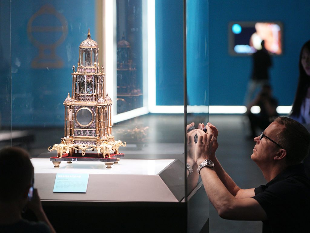 4月24日,观众在河北博物院拍摄“华彩珍蓝——河北珐琅艺术展”展品。闫志国摄