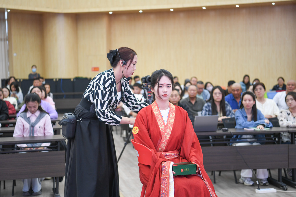 4月28日,邯郸市“五一”文旅志愿服务暨文明待客培训在市青少年活动中心举办。图为培训老师现场示范战国袍形象塑造。记者董源摄