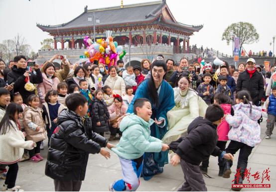 游客在洞庭南路参与互动表演游戏。徐典波摄