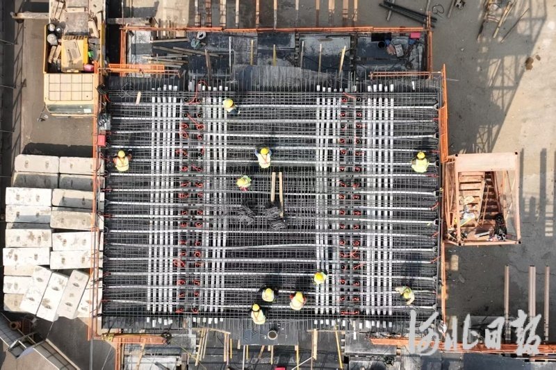 图为工人正在进行钢筋绑扎作业。