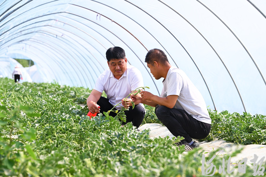 5月1日,董保立(左)在西瓜种植基地向村民传授西瓜人工授粉技术。
