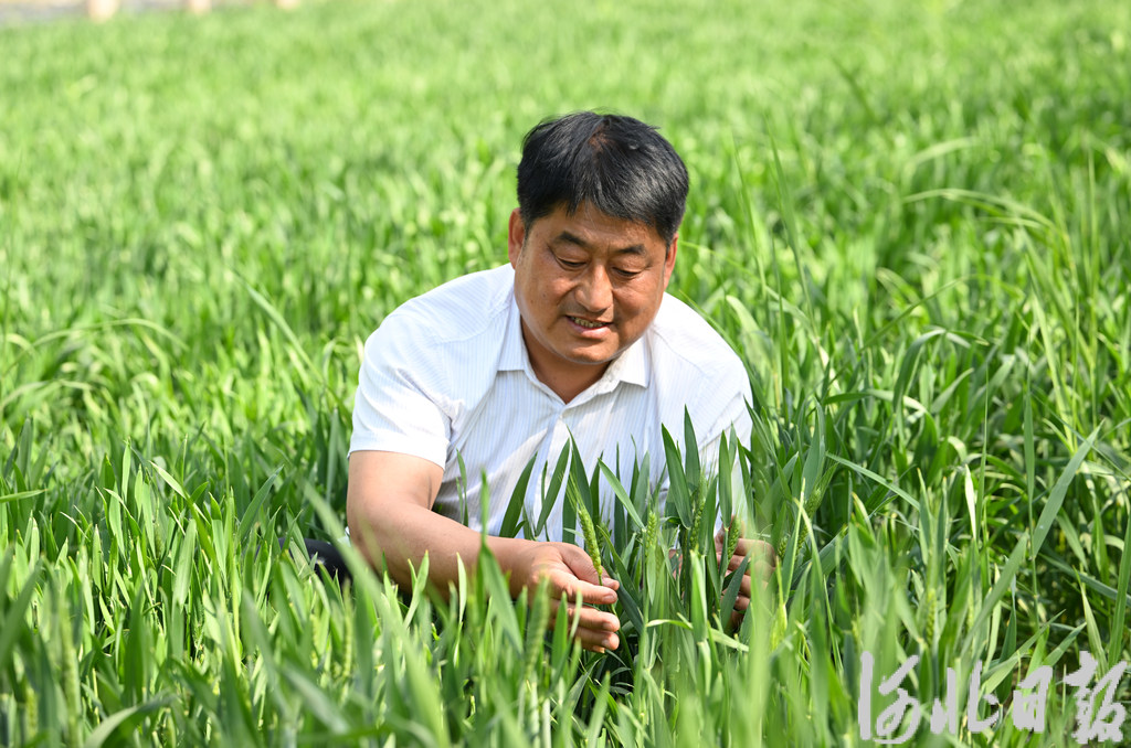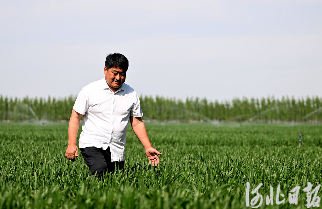 5月1日,全国劳动模范董保立在田间查看小麦长势。