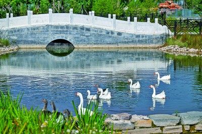 位于内蒙古准格尔旗的国家能源集团准能集团矿山生态旅游区内,一群鹅在水塘中游弋。新华社发