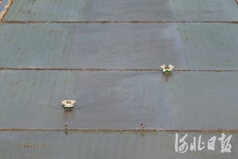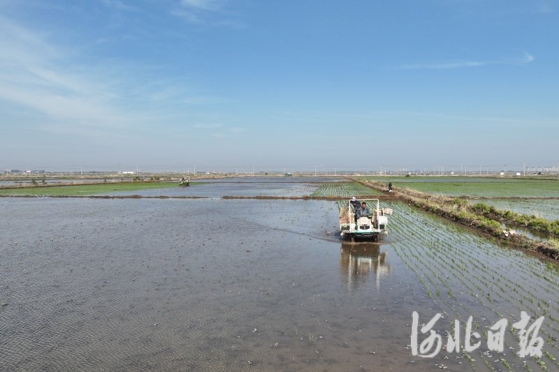 河北日报客户端讯(周欣莹、王帅、张欢)眼下正值水稻插秧季,唐山海港经济开发区大清河6800亩稻蟹综合种养示范基地内,插秧机正将翠绿秧苗整齐植入田间。