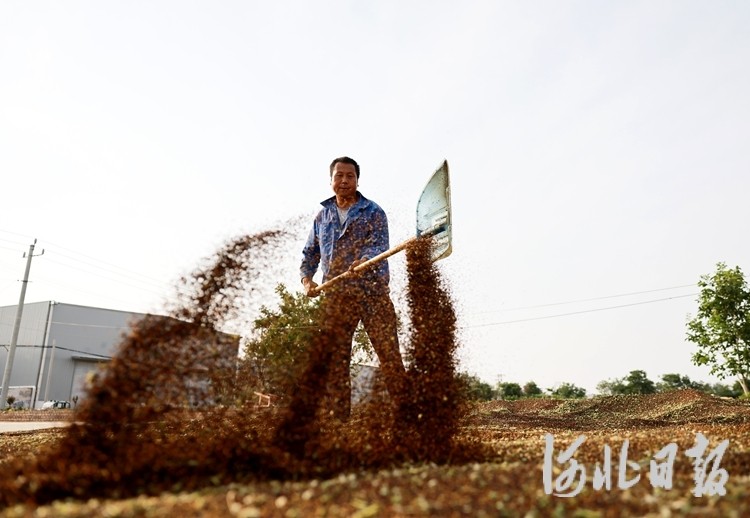 河北日报客户端讯(梁智晓)5月29日,邢台市广宗县东召乡板台集村中药材种植基地内,400余亩王不留行进入采收期,村民们正忙着收割、脱粒,田间地头一派忙碌景象。