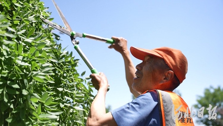 隆尧县泽畔村环卫工人正在修剪树木。王雪摄
