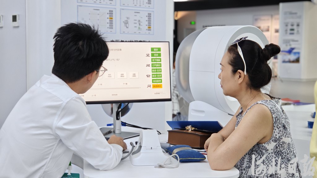 6月18日,第二届雄安未来之城场景汇未来城市场景体验周展厅内,参观者现场体验中医AI辅助诊断设备“望闻问切”。河北日报记者曹铮摄