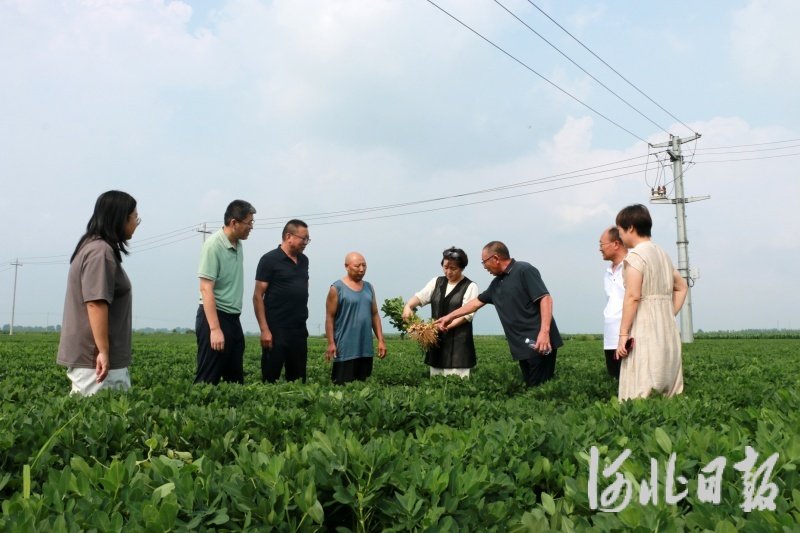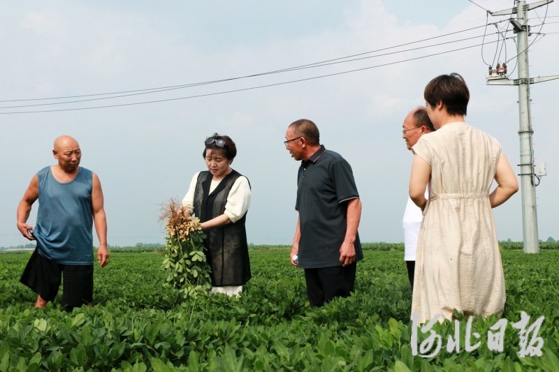 图为教授与农户一同走进东霍各庄村的田间地头,实地察看花生长势。韩志红摄