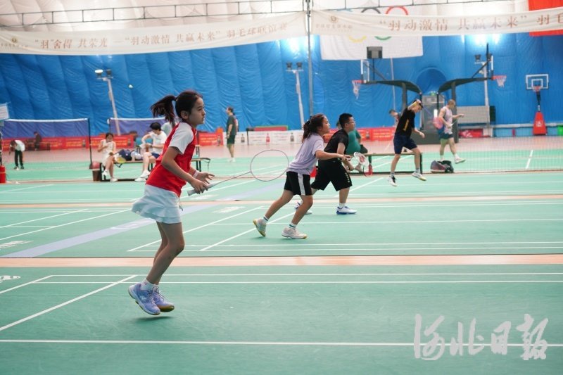 图为小朋友在唐山花海星球体育中心羽毛球馆练习羽毛球。
