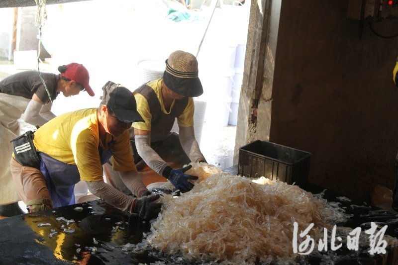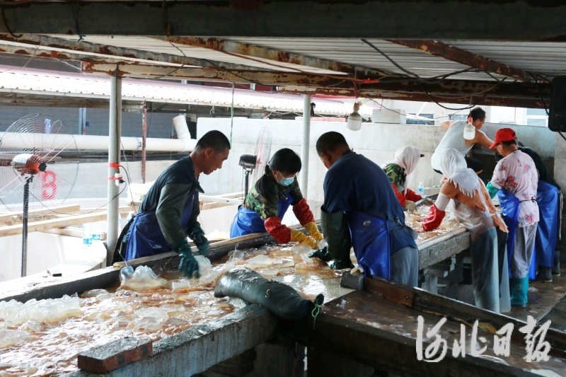 在滦南县南堡镇,规模较大的海蜇加工厂共5家,每家在捕捞期内能处理海蜇千万斤以上、加工收益30余万元。据悉,全镇加工后的海蜇产品主要销往东北、山东、广东等地,不少买家专程上门采购。