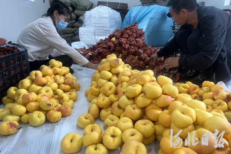 图为果农正在分拣油蟠桃。