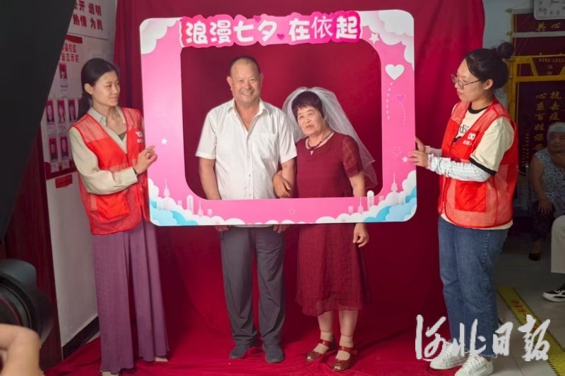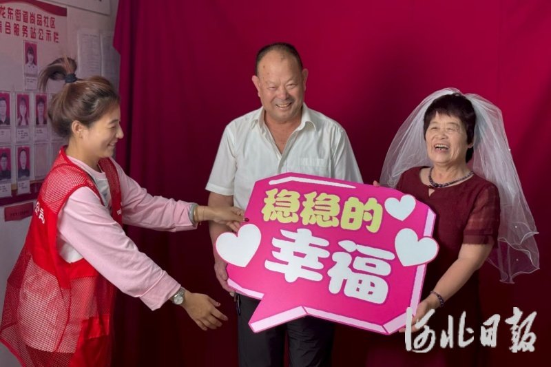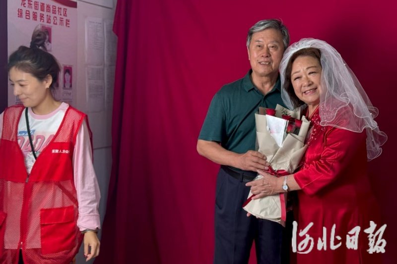 活动伊始,4对老年居民携手来到社区。工作人员细心为他们整理仪容着装。在拍摄前,社区设置了赠送贺卡环节,老人们书写对伴侣的真情告白和对年轻人的殷切寄语。“十年修得同船渡,百年修得共枕眠。年轻人要珍惜身边人,认真对待婚姻。”高阿姨书写时诚恳地说道。随后的分享环节,老人们谈起没有华丽婚礼却踏实温暖的往日,传递着“心往一处想、劲往一处使”的婚姻智慧。