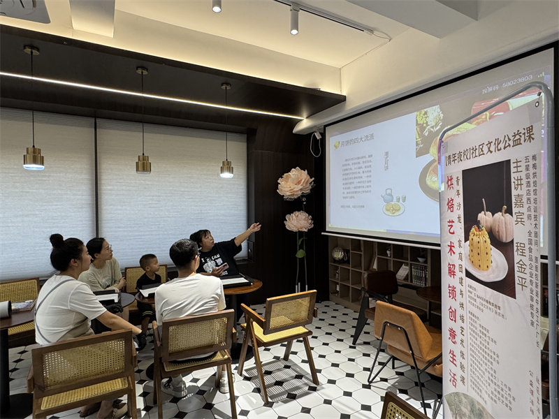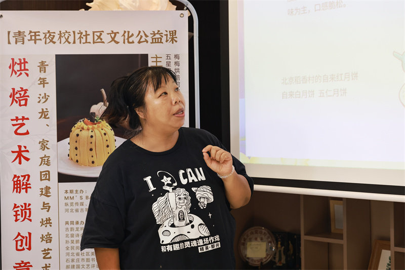 8月24日晚,在石家庄市长安区MM'S BAKER梅梅烘焙馆,社会工作者汪可友正在分享趣味月饼知识。